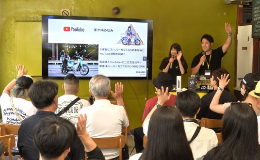 最初のセッションでは、大人気バイク系女子YouTuber 茅ヶ崎みなみさんに登壇いただき、Insta360の社員との対談形式で「Insta360のあるバイクライフ」をテーマに語っていただきました。茅ヶ崎さんの自己紹介から始まり、普段どのようにInsta360のカメラを使っているのか、Youtubeの動画での使用シーンなどを実際に見せていただきながら、カメラのバイクへのマウント方法、動画の編集方法等もご紹介いただきました。