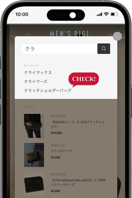 検索画面での画像表示検索画面で文字入力を行うと、AIが検索ワードから予測した商品画像が表示されるようになりました。この商品画像から直接商品ページへ遷移できます。