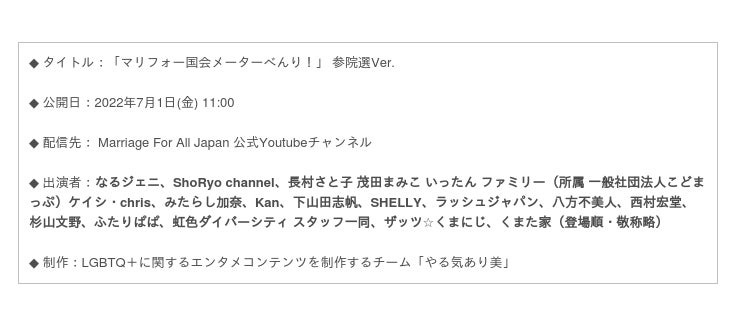結婚の平等を目指す、公益社団法人 Marriage For All Japan -結婚の自由をすべての人に(以下MFAJ)は、市民主導による同性婚の法制化を目指し、全国の当事者と賛同する市民の皆さまとの連帯を示すと同時に、国会議員の同性婚への意向を可視化するウェブアプリ「マリフォー国会メータ―」参院選特別版の利用を呼び掛ける同性婚啓発動画を公開しました。