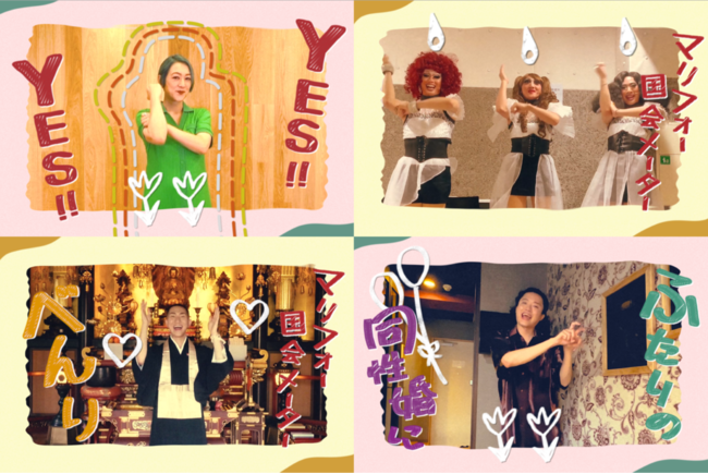 今回の動画では、結婚の平等(同性婚の法制化)を応援する日本全国の方々に出演いただきました。タレントのSHELLYさんをはじめ、僧侶・メイクアップアーティストである西村 宏堂さんや、海外発の人気番組「クィア・アイ」出演のKanさん、サッカー選手の下山田志帆さんの他、新宿2丁目発 本格派DIVAユニット「八方不美人」、英国発のナチュラルコスメブランドLUSH(ラッシュ)や国内のNPO団体のスタッフ様など、各界の方が参加し、軽快なダンスを披露。全国の結婚の平等を目指す当事者と市民の連帯を示すと同時に、参院選に向けて国会議員や候補者の同性婚の賛否がわかるウェブサイト「マリフォー国会メーター」の利用を促す内容となっています。
