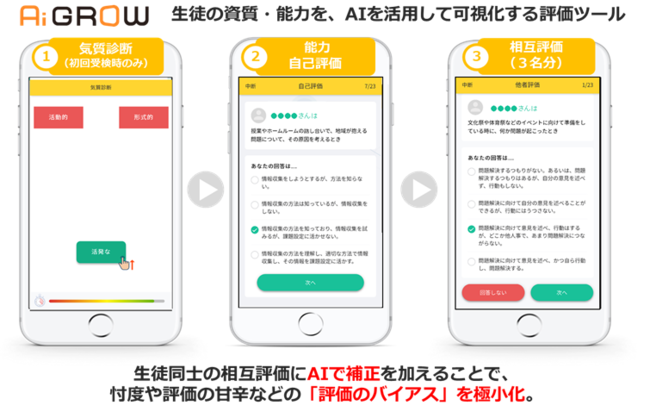 AIを活用した相互評価ツール「Ai GROW」は、児童・生徒の思考力・表現力・判断力等を可視化・データ化し、定期的に能力の成長を測ることが可能
