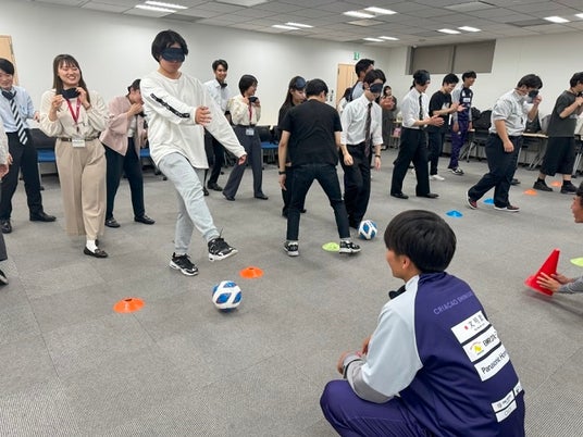 本研修は、ブラインドサッカーの「見えない状況でのチームワーク」という特性を活かし、参加者がアイマスクを着用しながらコミュニケーション能力や主体性を養うワークショップ形式で行われます。ブラインドサッカー選手や専門のファシリテーターがサポートし、「ダイバーシティ理解」「伝える力」「傾聴力」「チームビルディング」など、現代ビジネスに欠かせないスキルを体感しながら学ぶことができます。