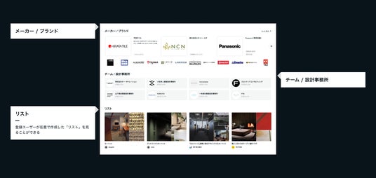 ユーザーの「検索体験」の向上を第一に掲げた今回のリニューアルでは、トップページのユーザーインターフェィス(UI)のデザイン性を高めています。膨大なデーターベースを、「プロジェクト(空間事例)」「製品(プロダクト)」「メーカー / ブランド」「チーム / 設計事務所」[*1] の見出しで紹介。「リスト」[*2] もより活用できるように表示され、情報を直感的にキャッチアップすることができます。