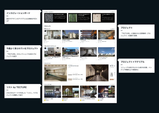 tecture株式会社(東京都渋谷区、代表取締役CEO:山根脩平 以下:TECTUREと略)は、同社が運営する建築・インテリア業界向け検索プラットフォーム「TECTURE」のトップページを大幅にリニューアルしました。これまで以上に圧倒的なユーザーエクスペリエンス(User eXperience: UX)の向上、検索体験の向上を目指したもので、これにより、「TECTURE」に登録された膨大な数の建築プロジェクトはもちろん、新規に「TECTURE」に参加したメーカーの検索や、話題の建材といった業界のトレンドのキャッチアップもいっそう容易となっています。