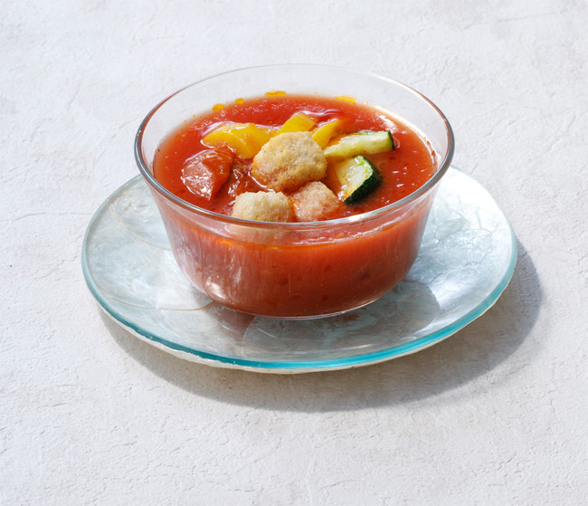 完熟トマトをベースに岩塩やクミンを加え、トマトの甘みや爽やかさ、深いコクを引き出した、夏野菜のガスパチョです。グリルした夏野菜とクルトンをトッピングし、満足感のある一品です。
