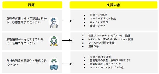 また、社内にマーケティングを推進する人材や組織体制がない企業に対し、戦略面のコンサルティングや一部の施策のみ支援するだけでは限定的な効果しか得られない、という問題点もあります。