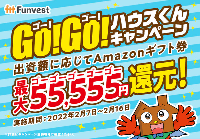 また、本ファンドに投資していただいた投資家の皆様を対象として、出資額に応じて最大55,555円分のAmazonギフト券を進呈する「Go!Go!ハウスくんキャンペーン」も併せて実施いたします。