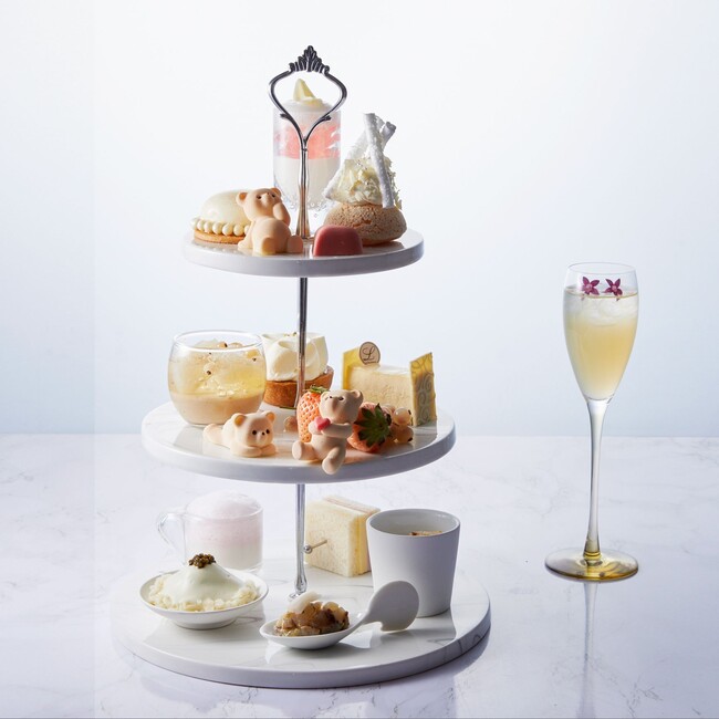 淡いカラーに変身した「LOUANGE TOKYO」のキャラクター"ヌーミー"はオプションで増量可能、さらに可愛らしいアフタヌーンティーへ仕上がります。ドリンクはオーガニックハーブティー9種類から選ぶことができ、おかわり自由でゆったりとしたティータイムをお楽しみいただけます。