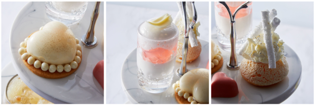 “ホワイトチョコアップル”のウェルカムドリンクをはじめ、“レアチーズケーキ”や“アールグレイのプリン”など、こだわりの食材で作り上げた純白の世界を、アートのように美しいスイーツでお楽しみいただけます。下段のセイボリープレートももちろん白一色。“クラムチャウダー”や“カニとトリュフの玉子サンド”等、白にこだわったメニューが並びます。
