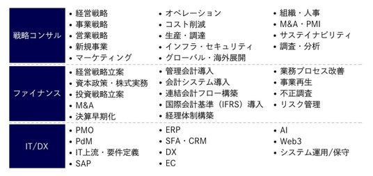 また、Big4各社やアクセンチュアといった外資系総合コンサルティングファーム出身で、IT・DX領域に強みを持つマネージャークラス以上の人材や、ファイナンス領域に特化した外資系FAS(主にBig4)出身の同等レベルのプロフェッショナルなど、各分野で豊富な実績を有するハイタレントも多数登録しています。