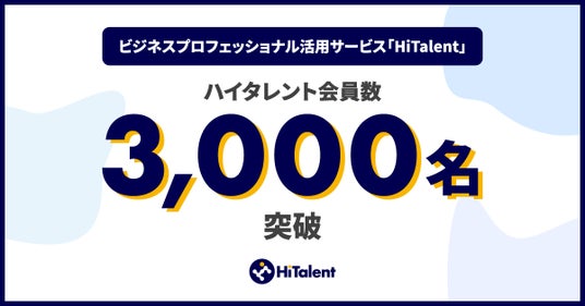 優秀な個の選択肢と可能性を広げるハイタレント株式会社(本社:東京都港区、代表取締役:有吉洋平、以下、ハイタレント)は、運営するビジネスプロフェッショナル活用サービス「HiTalent」(https://hitalent.me/for_client/)において、審査通過済みのハイタレント会員数が3,000名を突破したことをお知らせします。