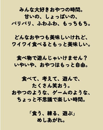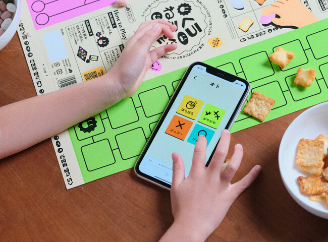 お菓子は道具にしたり、組み合わせて絵や文字にしたり、 ゲームのコマにしたり、勝った時のご褒美にしたり、食べ方も遊び方も自由。ゲームシートやアプリをヒントにして、“自分で楽しみ方を考えて遊ぶ”おやつです。