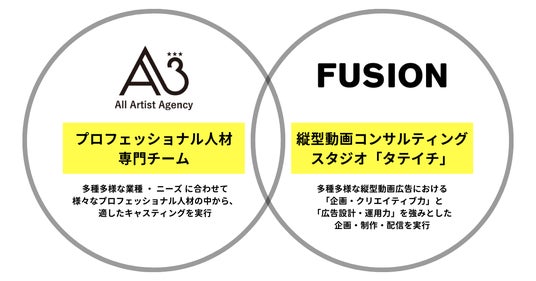 エイスリーがプロフェッショナル人材のキャスティング、FUSIONが縦型動画広告の企画・制作・配信設計をおこないます。