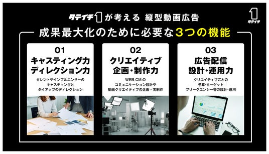 これらの要素を兼ね備えた「タテイチ」では、縦型WEBCM、縦型ライト撮影・編集、また、1,500名を突破した提携TikTokerの最適なキャスティング及びディレクションによって、パートナー企業の幅広いクリエイティブ制作をサポートして参ります。