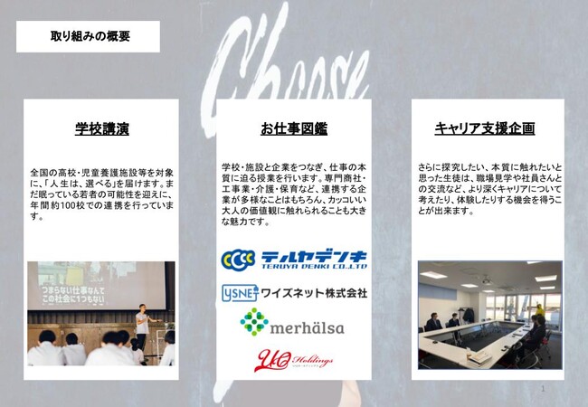 日本の様々な業界を代表する企業、団体と連携をして、その業界の歴史、文化、そこで働く方々の志と想いを次世代の若者に伝え、継承していく取り組みです。全国の高校を対象に、キャリア教育の時間を活用した業界・企業研究を実施します。若者が選択を行う際に、「知らなければ選択することも出来ない」という課題に焦点を当て、”知る”ことから、興味関心を広げたり、自らのキャリアについて深く考えたりする姿勢を育むことで、主体的なキャリア選択・人生選択に繋げていきます。