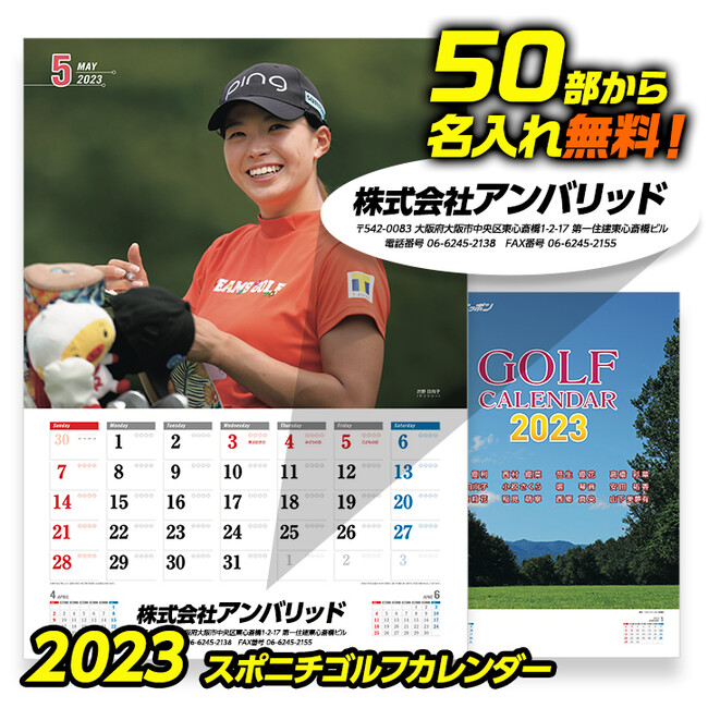 ゴルフコンペ景品とギフトのお店「エンタメゴルフ」を運営する株式会社アンバリッド(大阪府大阪市)が、2023スポニチ ゴルフカレンダーの取り扱いを開始しました。12名の人気女子トッププロゴルフファーが登場する毎年人気の商品です。50部以上は無料で名入れ可能、年末のギフトや配りものに喜ばれます。