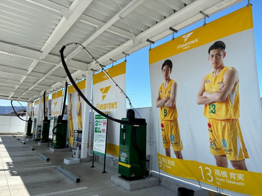 ヤマウチセルフ高瀬は、プロバスケットボールチーム「香川ファイブアローズ」を応援する特別装飾を実施し、店舗全体がファイブアローズカラーに染まりました。