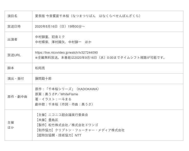 今年も春の「ニコニコネット超会議2020」で上演予定だったが、新型コロナウイルスの感染拡大により中止。6月の京都南座公演も中止となり、今回の「双方向オンライン公演(無観客)」決定のニュースは、「もう今年は無理かも……」と諦めていたファンにとっては「待ってましたっ!」の発表だった。