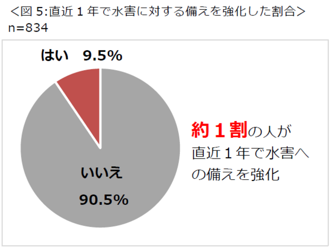 また、「直近1年で水害に対する備えを強化しましたか」と尋ねたところ、約1割の人が強化をしていることが分かりました(図5)。