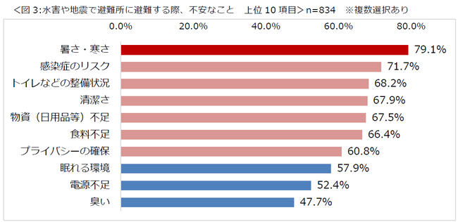 「水害や地震災害で避難所に避難する際、不安なことは何ですか」という問いには、7割以上の人が「暑さ・寒さ」、「感染症のリスク」を挙げ、「トイレなどの整備状況」「清潔さ」「物資(日用品等)不足」「食料不足」「プライバシーの確保」についても6割以上の人が不安を感じていることが分かりました (図3)。