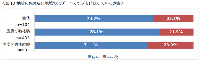 「地震が起きたときに備え、居住地域のハザードマップを確認していますか」と尋ねたところ、全体の7割超が「はい」と回答しました。さらに、過去に震度5強以上の地震を経験したことがある人の78.1%がハザードマップを確認しており、震度5強以上の地震を経験していない人と比較して、7ポイント高いことが分かりました(図10)。
