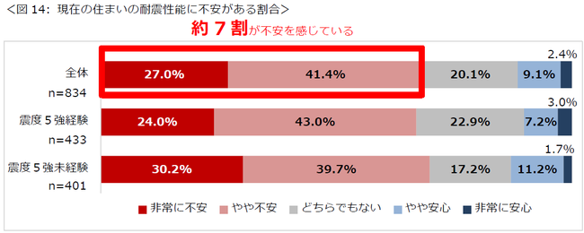 今の住まいの耐震性能に、全体の7割近くの人が不安を感じている。