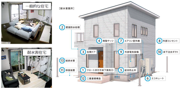 一般的な仕様の住宅において、床下・床上浸水すると考えられる箇所は複数存在します。当社はこれらを危険ポイントと定め、「浸水」「逆流」「水没」「浮力」の4つに分類。建物本体だけでなくサッシ等の開口部の水密性の向上、水の浸入・逆流を防ぐ特殊弁の採用などの対策を施しました(図中1~5)。また、外部の電気設備は、その本体や稼働に関わる部品を水没から免れる高さに設置することで、水害後も電気や給水・給湯などのライフラインを確保しています(図中6~9)。そして、浮力対策として、一定の水位に達した際に「床下注水ダクト」から水をあえて床下に入れ、その水を重りにして浮上を防ぐ「スタンダードタイプ」(図中10)、及び、浮力に逆らわずに安全に建物を水に浮かせ「係留装置」で元の位置に戻す「浮上タイプ」(図中11~13)の2つの仕様を開発しました。また、「浮上タイプ」の浮上時に、漂流物が建物の下に挟まった場合も、約半日の作業時間で復旧できる方法を確立しました。※1:自社調べ