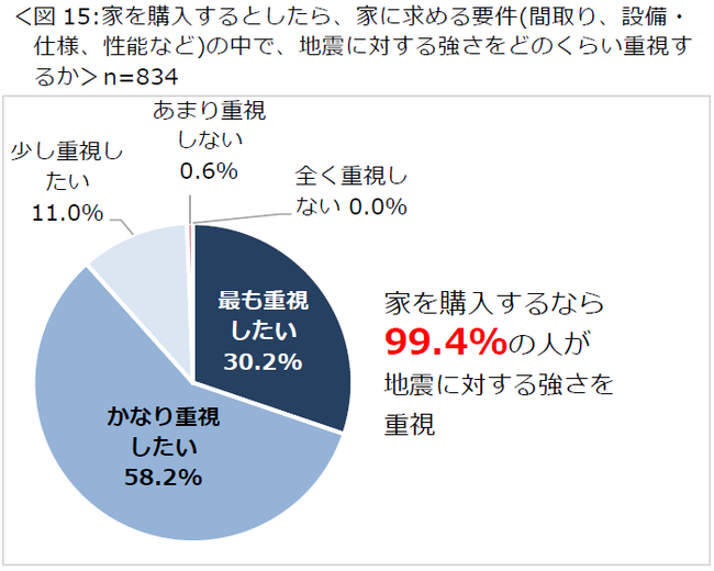 今後家を購入するとしたら、99.4%の人が地震に対する強さを重視すると回答。