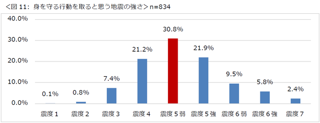 また、「どのくらいの強さの地震が来た場合に身を守る行動を取ると思うか」という問いでは、最も多かった回答が「震度5弱」でした(図11)。
