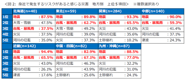 地方別に見ても、全国で「地震」が1位となり、続いて、北海道では「大雪・雪崩」、北海道以外の地方では「台風・暴風雨」が2位になりました。さらに、全国で「河川の氾濫」「火災」が上位5位に入りました(図2)。