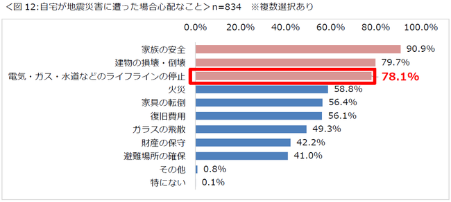 さらに、「自宅が地震災害に遭った場合、心配なことは何ですか」という問いには、「家族の安全」「建物の損壊・倒壊」に次いで、約8割の人が「電気・ガス・水道などのライフラインの停止」について不安を感じていることが分かりました (図12)。