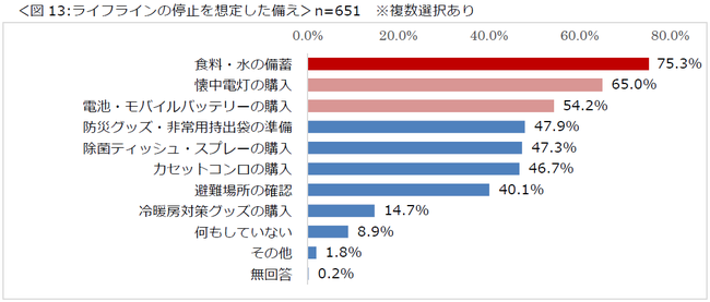 また、「電気・ガス・水道などのライフラインの停止」と回答した651人に、ライフラインの停止を想定してどんな備えをしているか尋ねたところ、「何もしていない」と答えた人は1割未満で、約9割が何らかの備えをしていることが分かりました。備えとして最も多いのは、7割以上の人が回答した「食料・水の備蓄」。次いで、6割以上の人が「懐中電灯の購入」、5割以上の人が「電池・モバイルバッテリーの購入」と答えました(図13)。