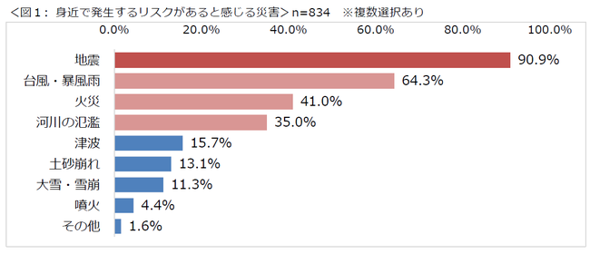 「身近で発生するリスクがあると感じる災害はどれですか」という設問に答えてもらったところ、「地震」が約9割でトップでした。また、6割以上が「台風・暴風雨」、4割以上が「火災」、3割以上が「河川の氾濫」と回答しました(図1)。