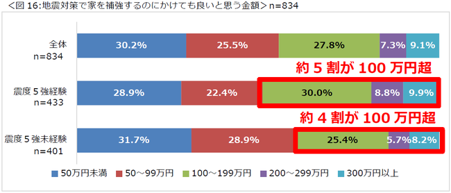 さらに「地震対策のために家を補強するとしたらどのくらいお金をかけても良いと思いますか」と尋ねたところ、全体で最も多かったのは「50万円未満」でしたが、震度5強以上の経験者では、「100~199万円」と回答した人が最多でした。震度5強以上の地震を経験していない人と比較して、100万円以上かけても良いと考える割合が約9ポイント高い結果となりました (図16)。