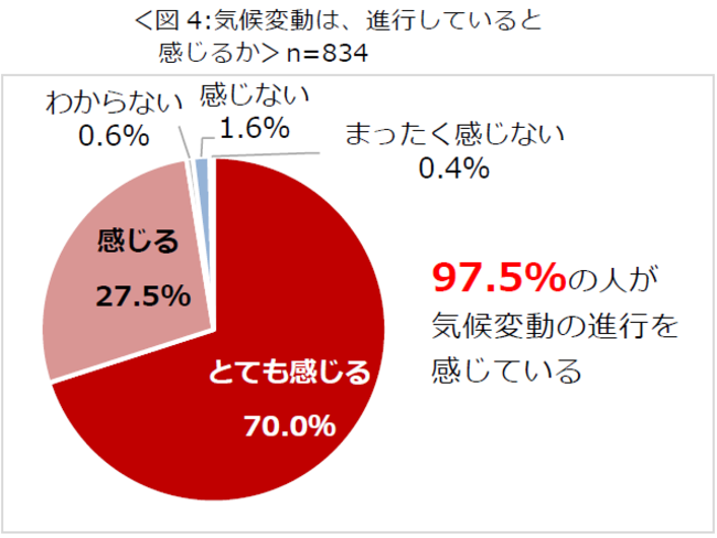 続いて、「気候変動は、進行していると感じますか」と尋ねたところ、「とても感じる」と回答した人が7割を占め、「感じる」と回答した人と合わせると、ほとんどの人が気候変動の進行を感じていることが分かりました(図4)。