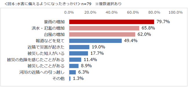 直近1年で水害への備えを強化した79人に、そのきっかけを尋ねたところ、「豪雨の増加」が約8割と最も多い結果となりました。また、「洪水・氾濫の増加」「台風の増加」と答えた人も6割以上いました (図6)。