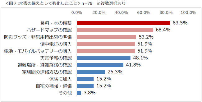 さらに、直近1年で水害への備えを強化した79人に、強化した点を尋ねたところ、8割以上が「食料・水の備蓄」と回答。また、6割以上の人が「ハザードマップの確認」、5割以上の人が「防災グッズ・非常用持出袋の準備」「懐中電灯の購入」「電池・モバイルバッテリーの購入」を挙げました (図7)。