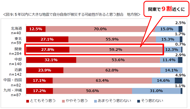 地方別では、「とてもそう思う」と答えた人の割合が最も多かったのは「中部」で、3割以上が回答。続いて、「関東」、「東北」の順に多くなりました。また、「とてもそう思う」と「ややそう思う」を合わせると、5年以内に被災する可能性を感じている人の割合は「関東」が最も高くなり、9割近くにのぼりました(図9)。