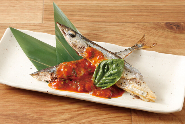 バジルの香りとトマトの酸味がさんまとの相性抜群!ワインのお供にどうぞ。
