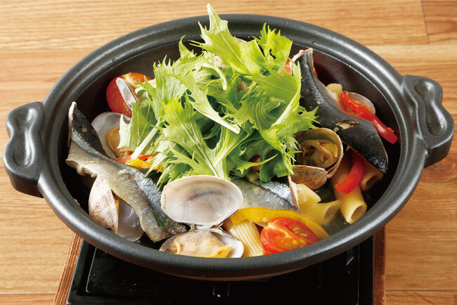 さんま・あさり・パプリカ・トマト・ペンネ等6種の食材を使用したアクアパッツアです。さんまとあさりのダシが素材によく合います。