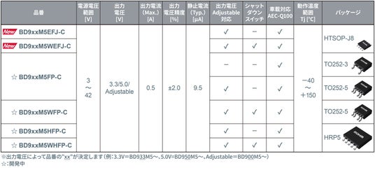 新製品「BD9xxM5-C」は、車載製品に求められる150℃動作や車載信頼性規格「AEC-Q100」準拠など、基本要求を満たしています。その上でQuiCur(TM)搭載による優れた応答性能や低消費電流を備え、搭載環境に応じて選択可能な幅広いパッケージを展開予定です。
