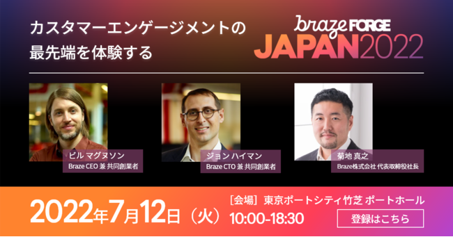「Human Connection」をミッションに掲げる統合型カスタマーエンゲージメントプラットフォームを提供するBraze株式会社(本社:東京都港区、代表取締役社長:菊地 真之、以下「Braze」)は、2022年7月12日、Brazeが主催するグローバルイベント「FORGE Japan 2022」( https://ter.li/zgywfv )を日本で初開催します。「最先端のカスタマーエンゲージメントを体験する」をテーマに、メルカリ、KFCのお客様事例セッションをはじめ、Braze CEO 兼 共同創業者ビル・マグヌソン、CTO 兼 共同創業者 ジョン・ハイマンによる基調講演、参加者がイベント会場内でモバイルアプリの活用を通じたカスタマーエンゲージメントを体験するプログラム( https://ter.li/zgywfv )を提供いたします。
