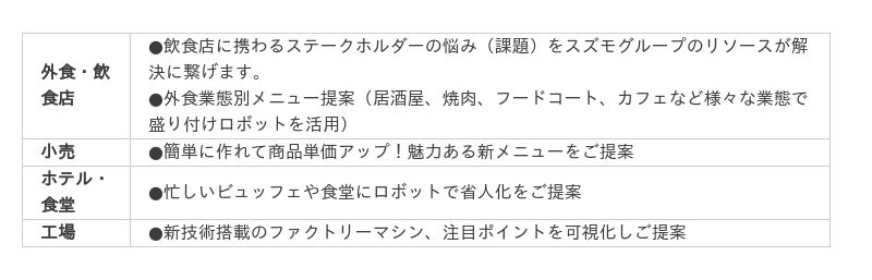 業態別に、スズモのロボットで作れる新メニューや売り場づくりなど、明日から使えるアイデアをご提案