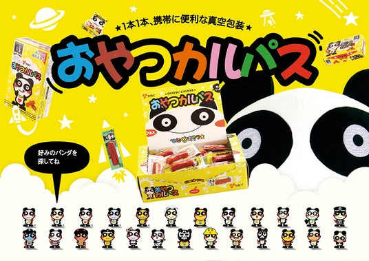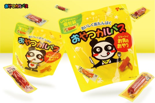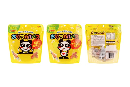 おやつカルパスは、ソフトな食感に仕上げることで、小さな子どもからおとなまで「お肉のおやつ」として、またお酒のおつまみとしても、幅広いお客様からご支持頂いている商品です。「ちょうどいい量、ちょうどいいサイズ」をコンセプトに、「持ち運びに、今日食べる分に、ちょうどいいサイズ」を目指した商品です。また、デザインはパンダのポーズ違いが2種類あります。