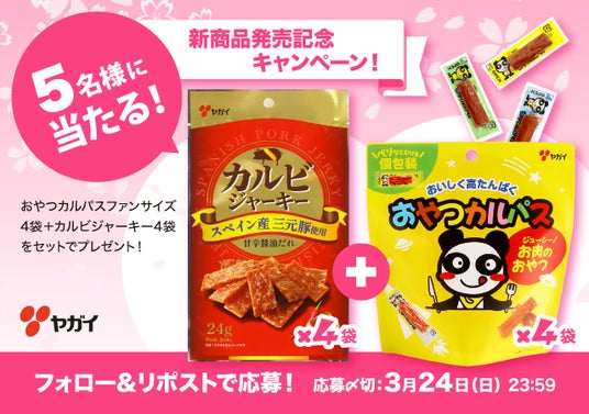 賞品:「おやつカルパスファンサイズ」4袋と、同じく新商品の「カルビジャーキー」4袋をセットにして5名様にプレゼント