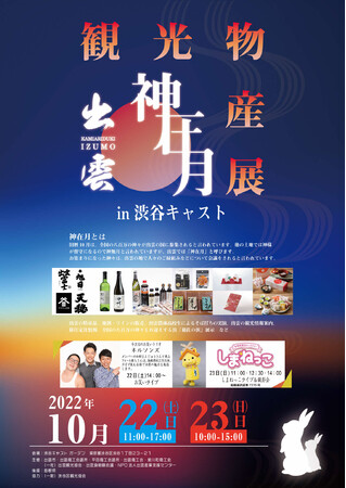 10月22日(土)、23(日)の両日、渋谷キャストにおいて出雲の観光物産展を開催します。出雲の特産品、地酒・ワインの販売、出雲農林高校生によるそば打ちの実演、出雲の観光情報案内などを行います。また、島根県観光キャラクターしまねっこによるステージイベント、松江市出身のお笑いトリオ「ネルソンズ」によるお笑いライブなど盛りだくさんの内容でお待ちしています。この機会に、神在月 出雲 の雰囲気を東京で感じてみてはいかがでしょうか。