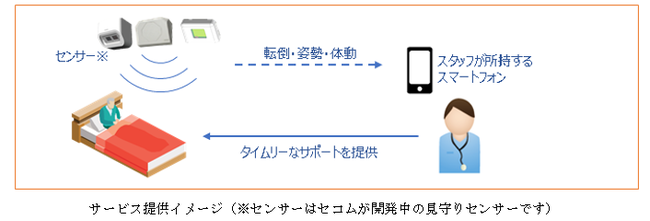 この度の検証試験は、セコムが「セコム・ホームセキュリティ」の見守りサービスのために開発中のセンサーを活用し、スタッフの目が届きにくい「居室内で、おひとりで過ごされる場面」を見守り、センサー情報のリアルタイム通知やデータ分析を通じて、迅速なケア対応や客観データに基づく最適なケア計画の構築などにつなげ、入居者のQOL向上に役立てることを目的としています。本検証試験を通じてセンサーの開発を更にすすめ、「セコム・ホームセキュリティ」においては、健康状態や生活環境に応じた最適な見守りサービスの提供を、介護事業所向けとしては、質の高い介護サービスと業務効率化を実現するサービスの提供を目指します。
