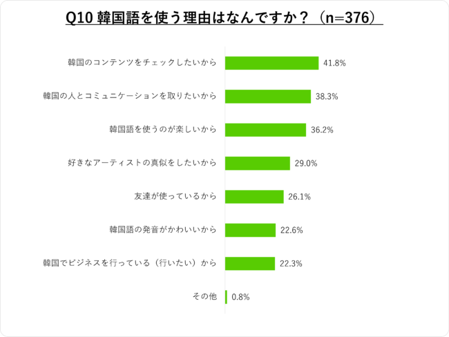 韓国語の使用頻度に関する質問では、40%以上が週1回以上韓国語に触れており、積極的に韓国語を使っている様子が見られました。中でも20代のうち49.2%、30代のうち33.1%が「週に1~3回」韓国語に触れると回答し、語学学習への熱の高まりが見られました。韓国語を使う人のシーンは、動画視聴と友人との会話がトップ2を占めるほか、韓国語を使う理由は、「韓国のコンテンツを楽しみたい」と答えた人が41.8%、「韓国の人とコミュニケーションを取りたい」と答えた人が38.5%となっており、ビジネスや資格試験を目的に学習されることの多い傾向がある英語に比べて、娯楽を目的として学習している様子が見られました。