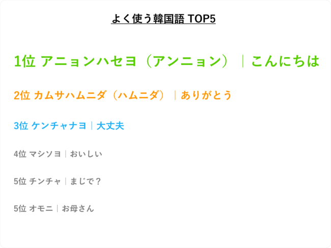 韓国語の中でよく使う言葉に関するアンケートでは、「アンニョンハセヨ」や「カムサハムニダ」などのスタンダードな言葉がトップを占め、「ケンチャナヨ」「マシソヨ」「チンチャ」など、日常的に汎用性が高い言葉もランクイン。会話の中で、韓国語を織り交ぜて楽しんでいる様子が伺えます。
