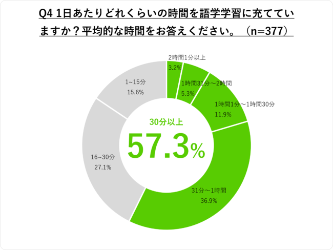 韓国語学習に対するモチベーションがある人は現在、約3割が週3回以上語学学習を行っているほか、学習している人の中でも1日あたり30分以上学習している人が半数を超えており、非常に熱心に韓国語学習を実施している様子が見受けられました。